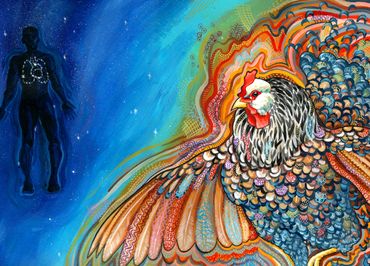 The Illustrated Hen weaves a mysterious tale about Ray who has become caught in a vortex of his imagination. As Ray confronts his fears, desires, passions, even the most mundane events become curious wonders in his journey of self-realization to find a way to acceptance, peace and transformation. Rachel created a wrap-around cover design with the prompt to paint an 'inter-dimensional, patterned, multicolored hen'.